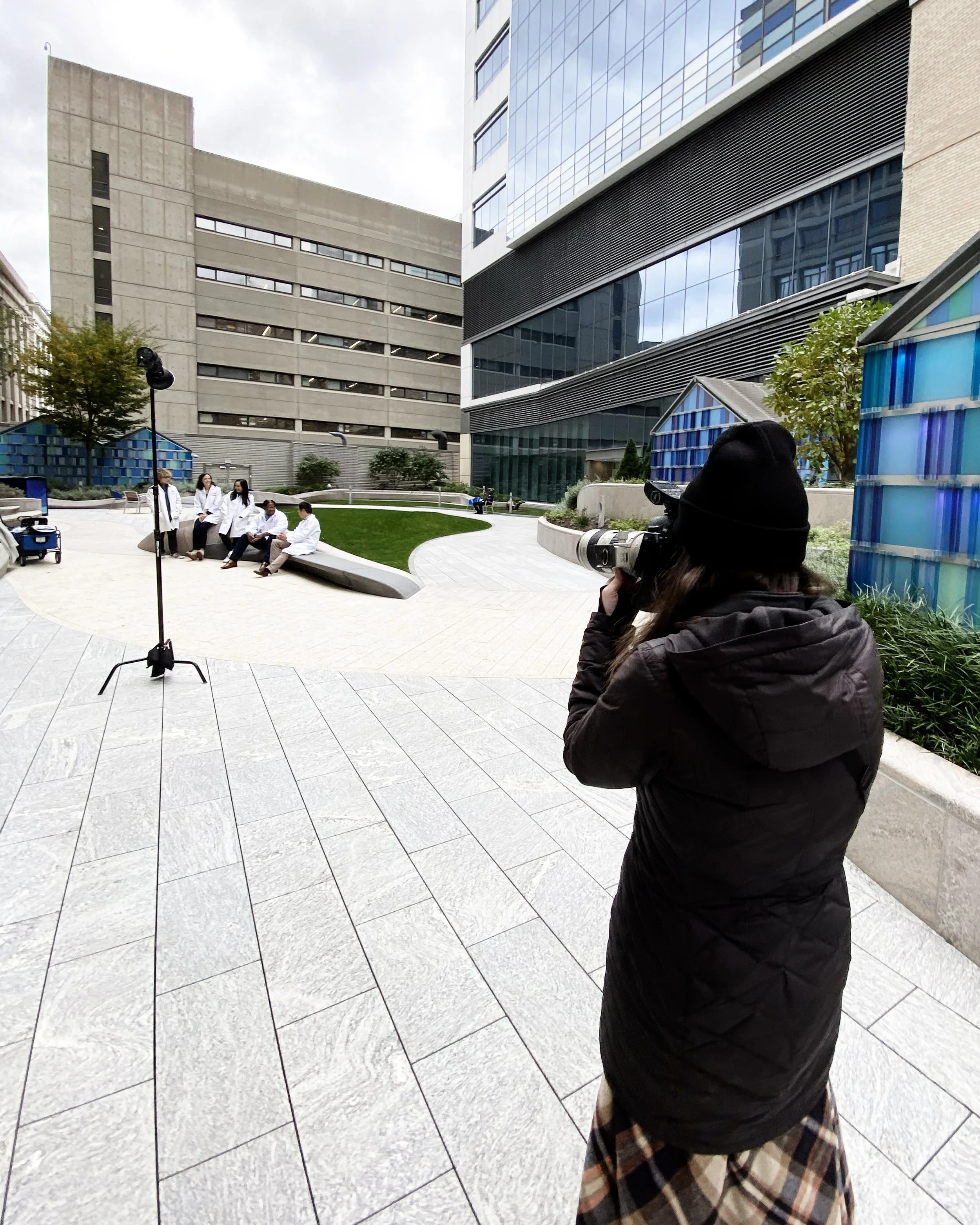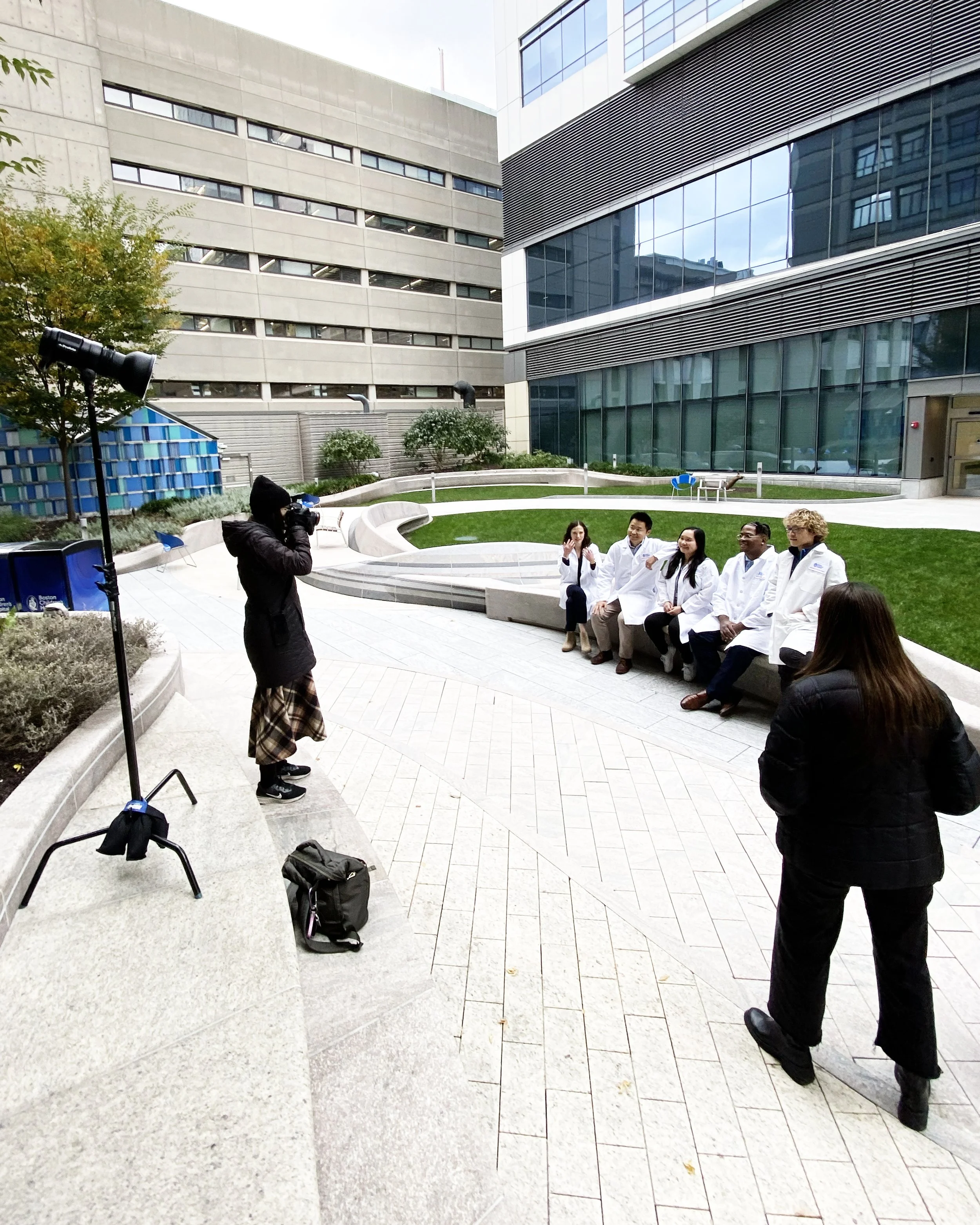 To achieve the “bird’s eye view” for this feature, I photographed from the stairwell on the 3rd and 4th floors of Boston Children’s Hospital! It was a team effort—Matt was on the ground with the doctors, holding my studio light and facilitating communication (he kept his phone on speaker, while I directed posing from above)!