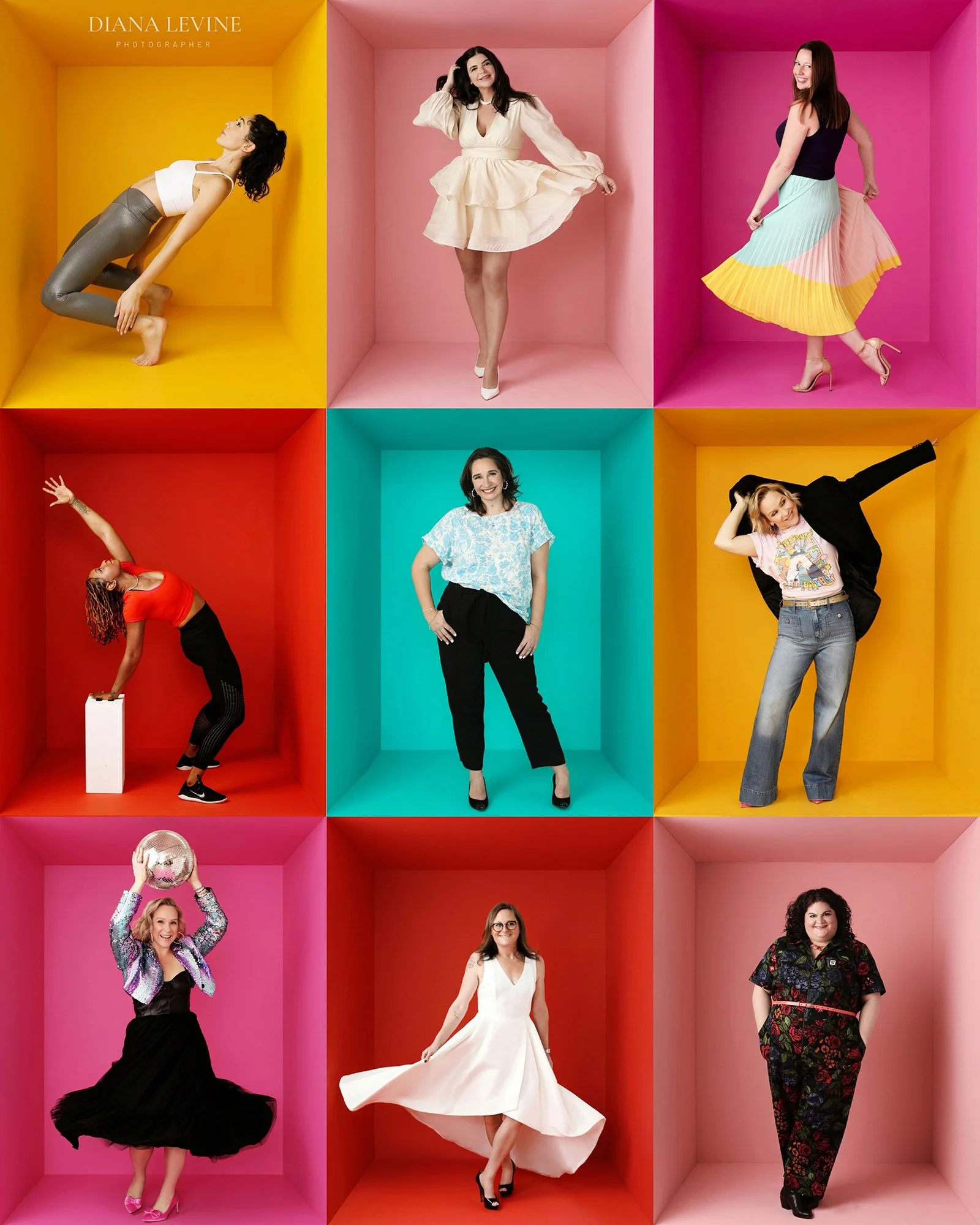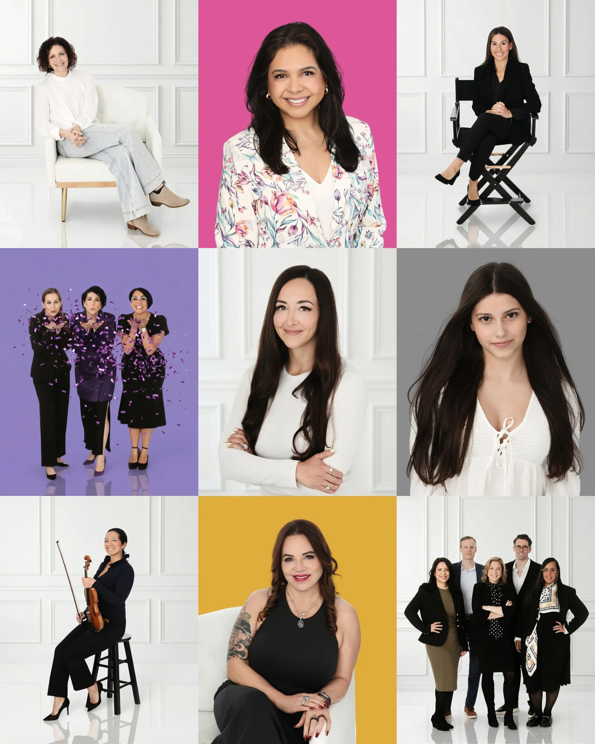 You have two choices for your session: You can choose a particular backdrop color (such as hot pink and turquoise, in the photo above). Or, you can choose the white backdrop and I can add in various backdrop colors in post (as shown below). The white backdrop is a good option if you’d like me to match the branding colors of your website, or you would like a variety of backdrop colors to choose from, with the same portraits.